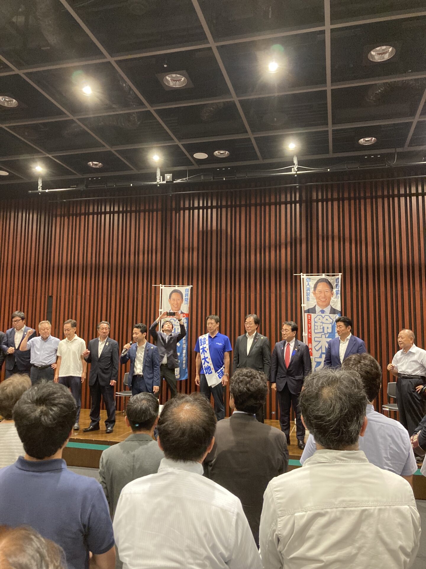 7月8日、当会特別顧問・黒崎祐一先生(自民党第27選挙区支部長)が発起人を務められた、鈴木大地氏(元スポーツ庁長官・オリンピック競泳金メダリスト)の講演会に、曙会から11名が参加いたしました。当日は、赤沢亮正 経済財政再生担当大臣も応援に駆けつけられ、250名収容の会場には立ち見も出るほどの盛況ぶりで、会場全体が熱気に包まれました。鈴木氏の経験に基づいたリアルなお話に、多くの学びと感動を得る機会となりました。